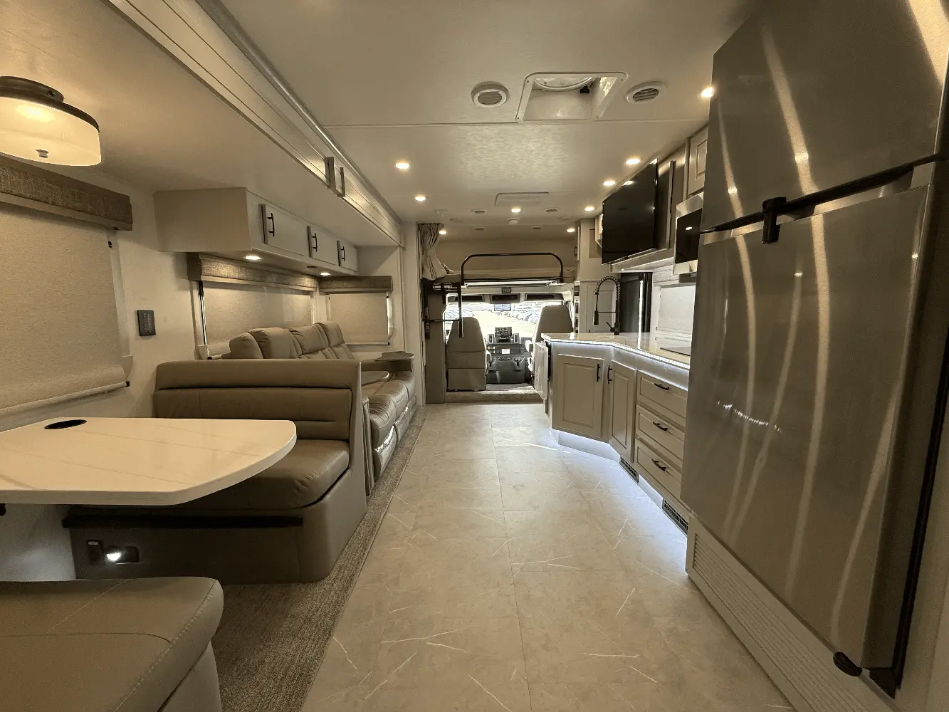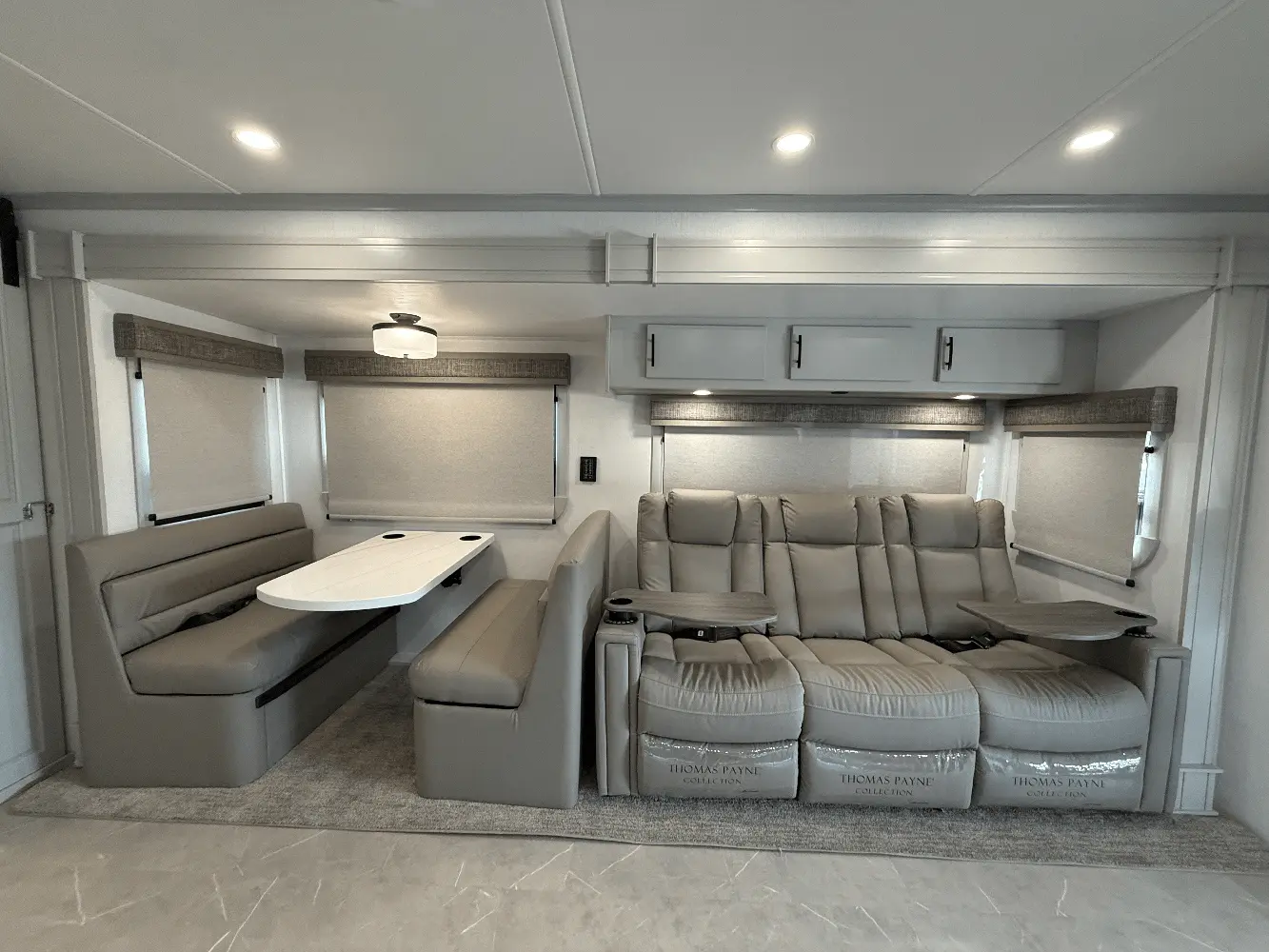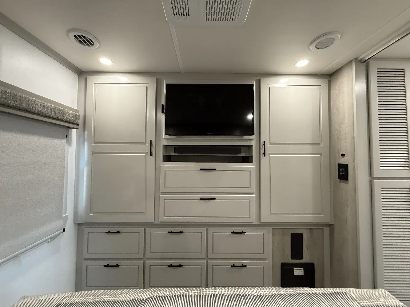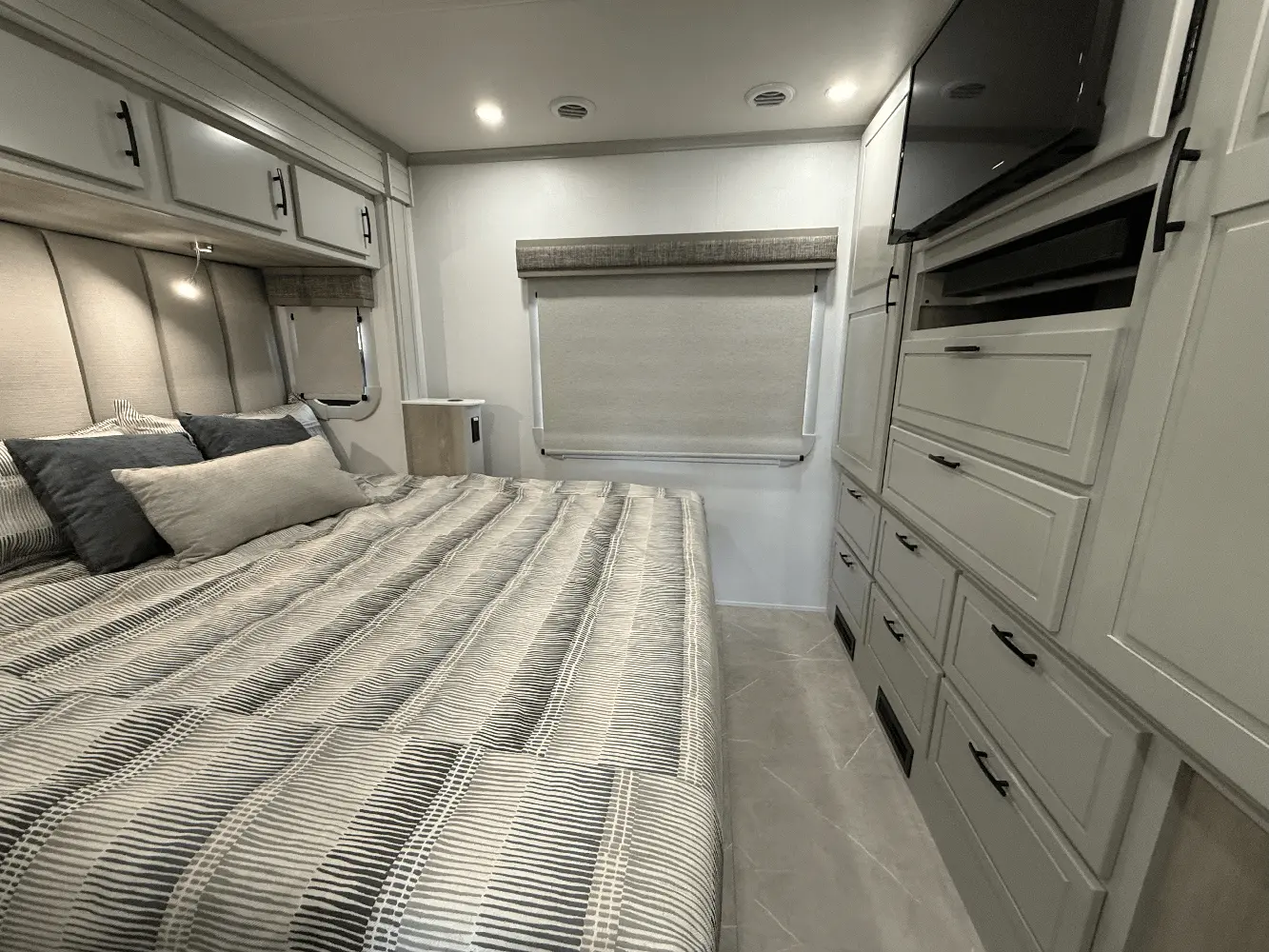 The 34KD has two slideouts and one entry. Exterior features include a TV/entertainment center. Interior layout front to back: cockpit with overhead cabinet (optional cab over bunk bed); off-door side cabinet, and slideout with tri-fold sleeper sofa (optional theater seating), overhead cabinet, and dream dinette; door side closet, entry, overhead cabinet, kitchen counter with extension, sink, TV, microwave, cooktop, refrigerator (optional 12V refrigerator), and pantry; pass through bathroom with toilet, shower and overhead cabinet on the door side and sink, overhead cabinet and closet with optional washer/dryer on the off-door side; rear bedroom with king bed, overhead cabinet and nightstands in a door side slideout, and wardrobes, drawers and TV cabinet with drawers below on off-door side.