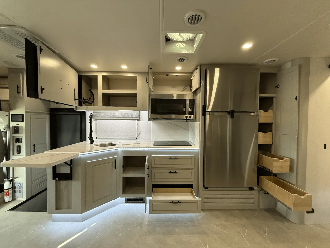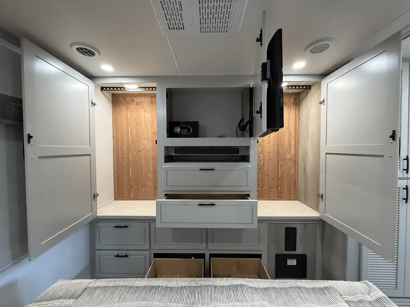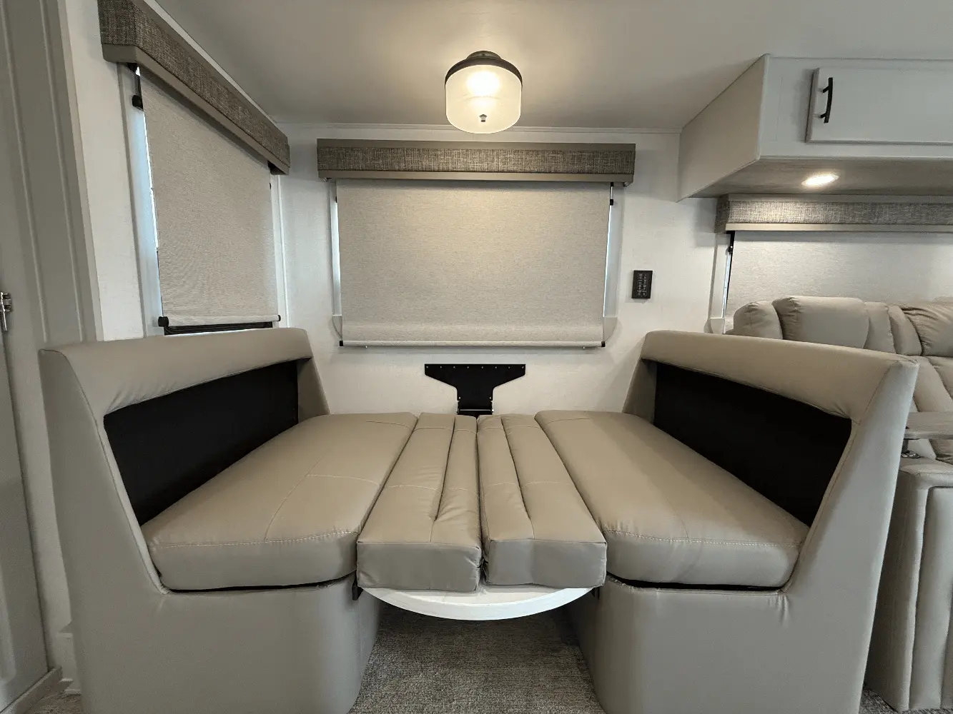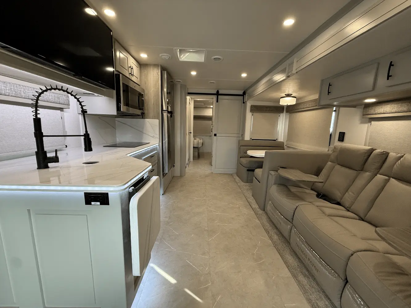 The 34KD has two slideouts and one entry. Exterior features include a TV/entertainment center. Interior layout front to back: cockpit with overhead cabinet (optional cab over bunk bed); off-door side cabinet, and slideout with tri-fold sleeper sofa (optional theater seating), overhead cabinet, and dream dinette; door side closet, entry, overhead cabinet, kitchen counter with extension, sink, TV, microwave, cooktop, refrigerator (optional 12V refrigerator), and pantry; pass through bathroom with toilet, shower and overhead cabinet on the door side and sink, overhead cabinet and closet with optional washer/dryer on the off-door side; rear bedroom with king bed, overhead cabinet and nightstands in a door side slideout, and wardrobes, drawers and TV cabinet with drawers below on off-door side.