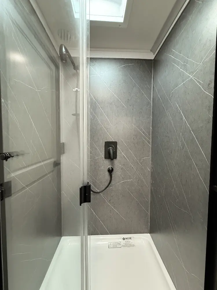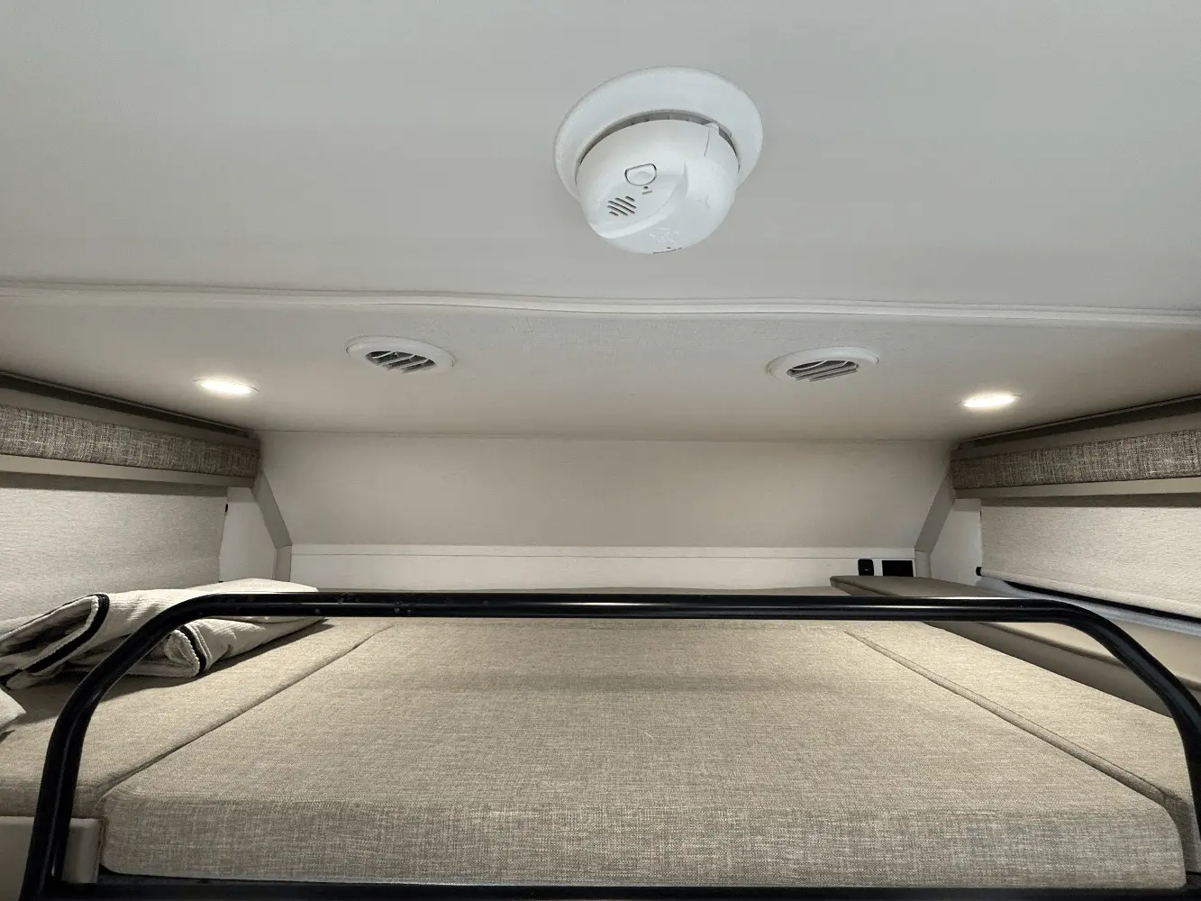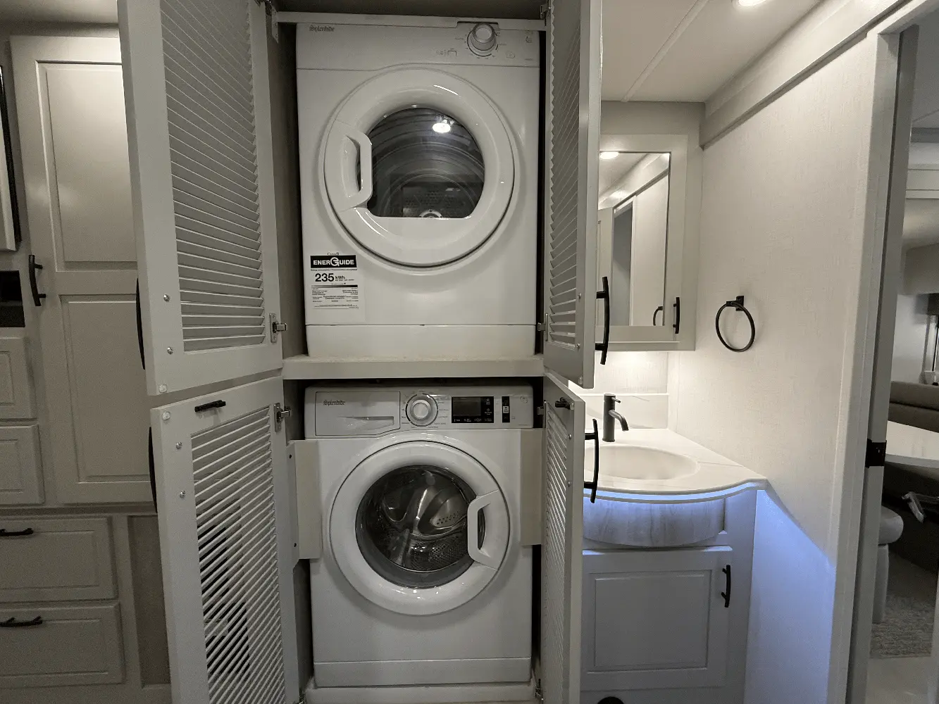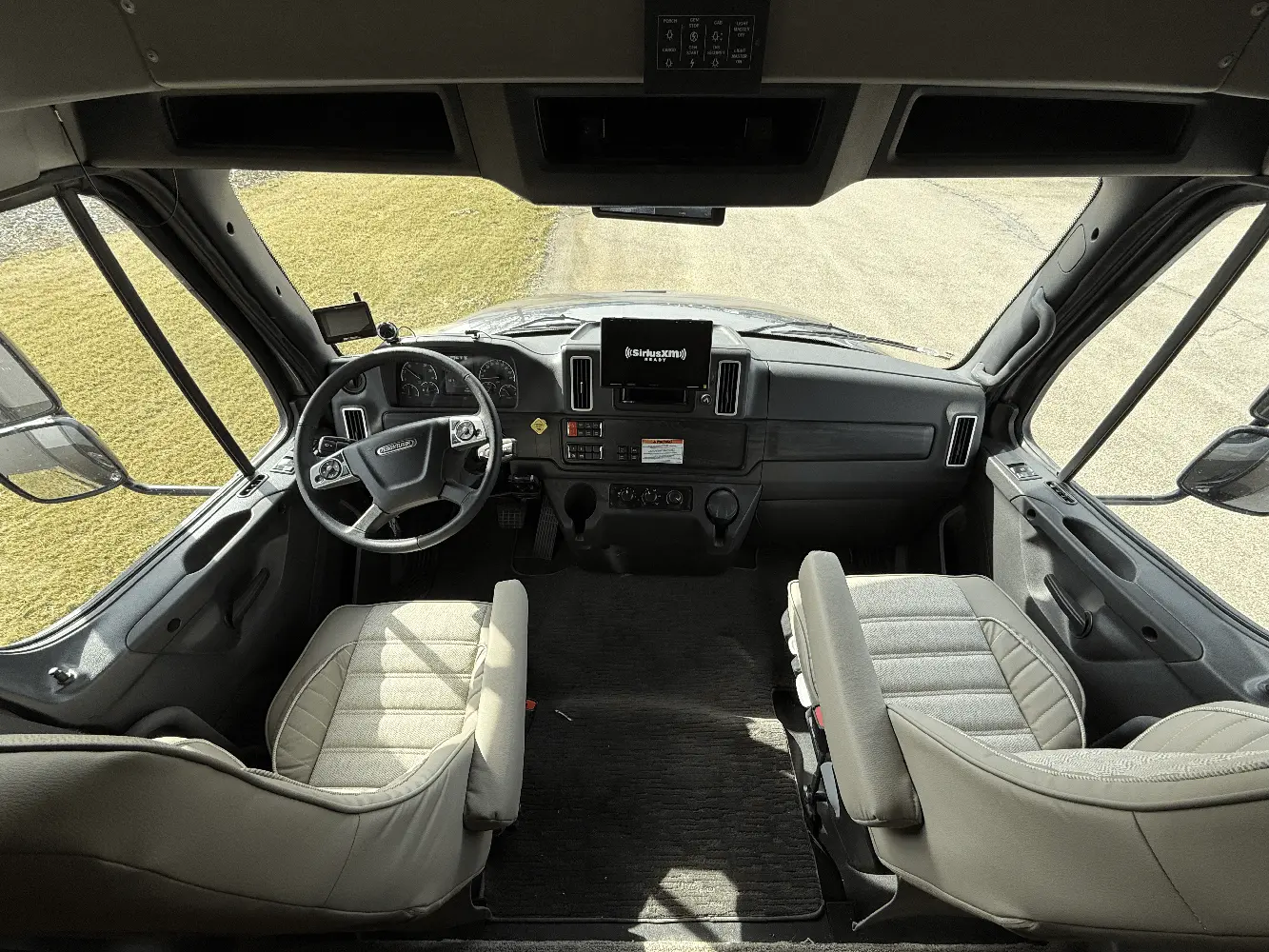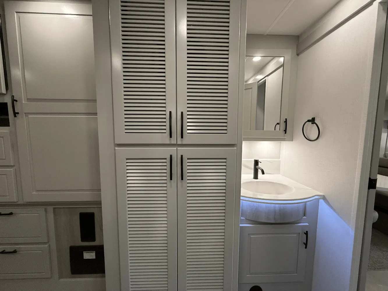 The 34KD has two slideouts and one entry. Exterior features include a TV/entertainment center. Interior layout front to back: cockpit with overhead cabinet (optional cab over bunk bed); off-door side cabinet, and slideout with tri-fold sleeper sofa (optional theater seating), overhead cabinet, and dream dinette; door side closet, entry, overhead cabinet, kitchen counter with extension, sink, TV, microwave, cooktop, refrigerator (optional 12V refrigerator), and pantry; pass through bathroom with toilet, shower and overhead cabinet on the door side and sink, overhead cabinet and closet with optional washer/dryer on the off-door side; rear bedroom with king bed, overhead cabinet and nightstands in a door side slideout, and wardrobes, drawers and TV cabinet with drawers below on off-door side.