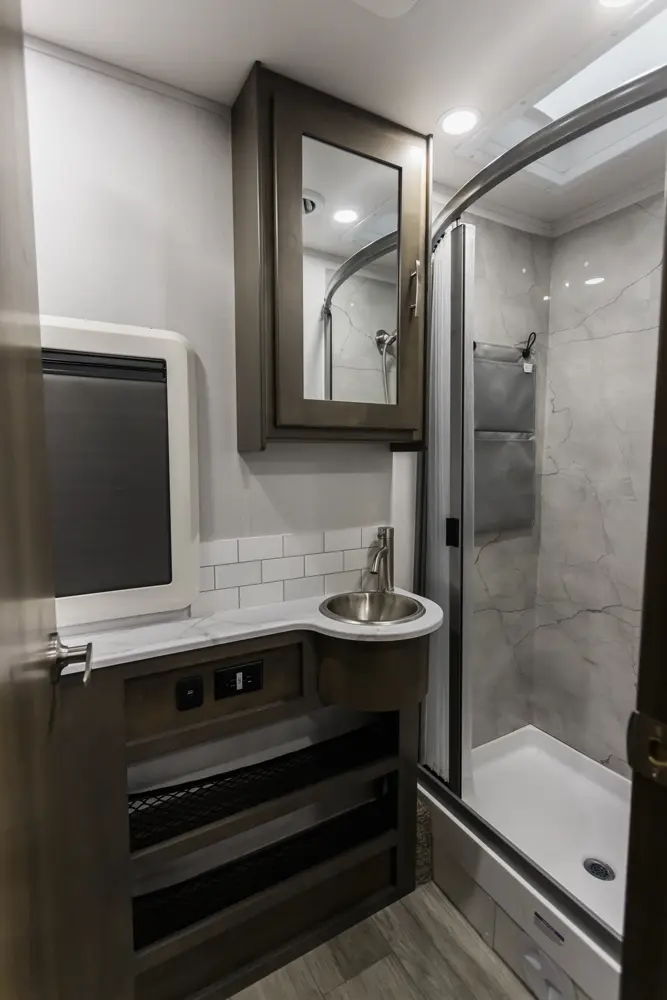 • Aerodynamic Fiberglass Front Cap with Cab-Over Cabinets