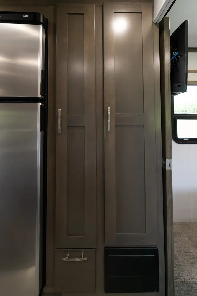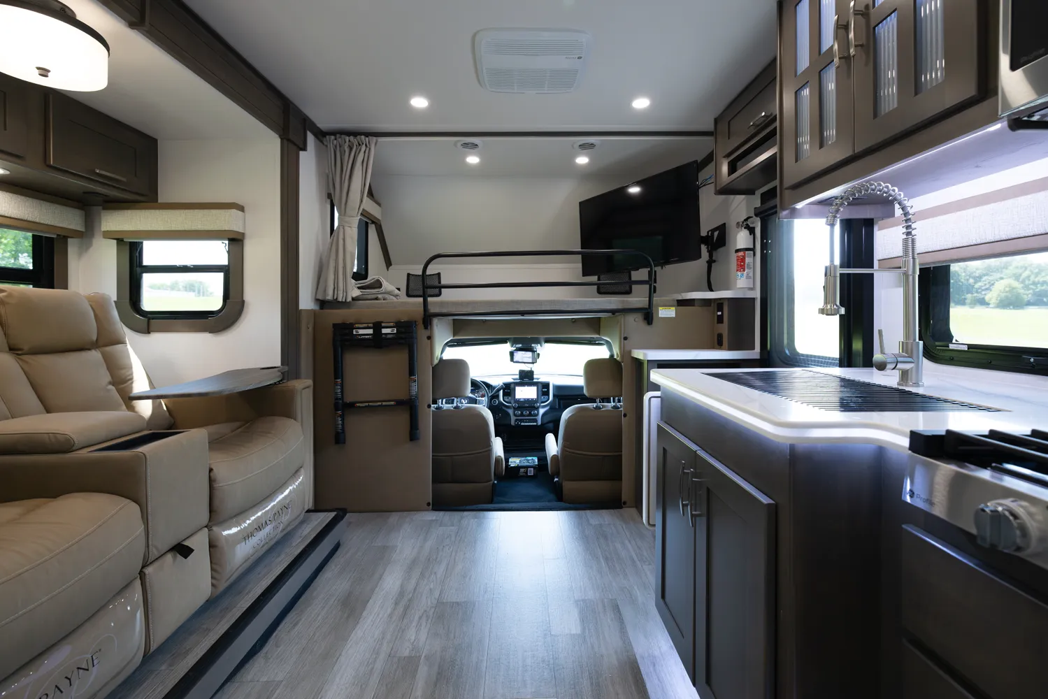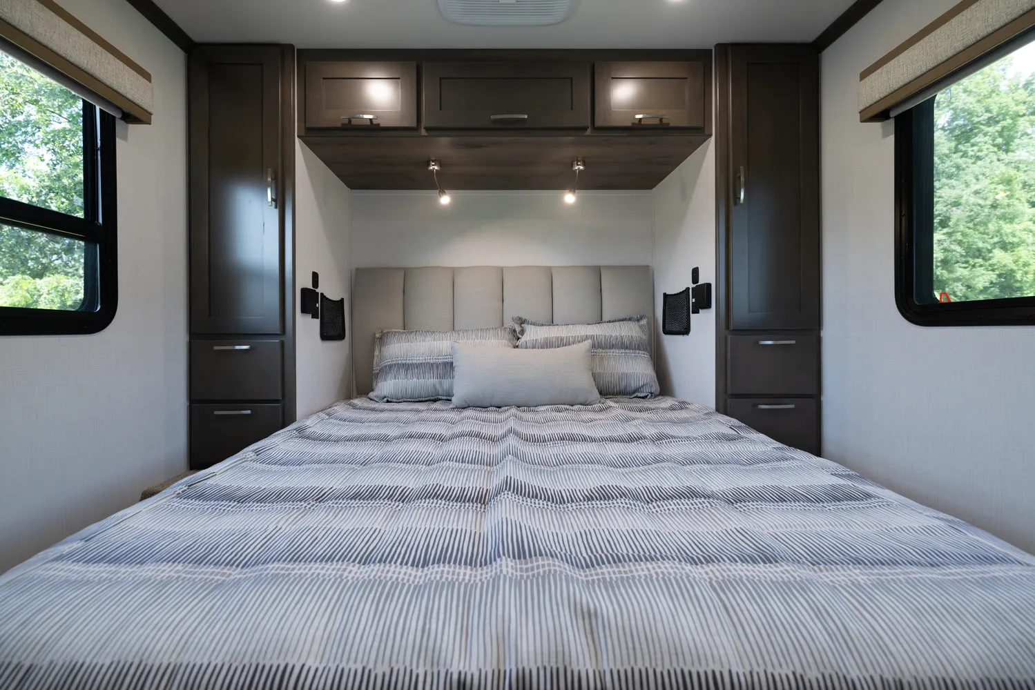 This 31'2" floorplan offers a private rear bedroom with a queen size bed, large wardrobe and pantry, standard booth dinette in the living area slide room, a fully equipped kitchen, and a full bath.
