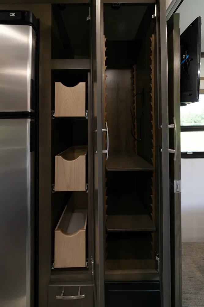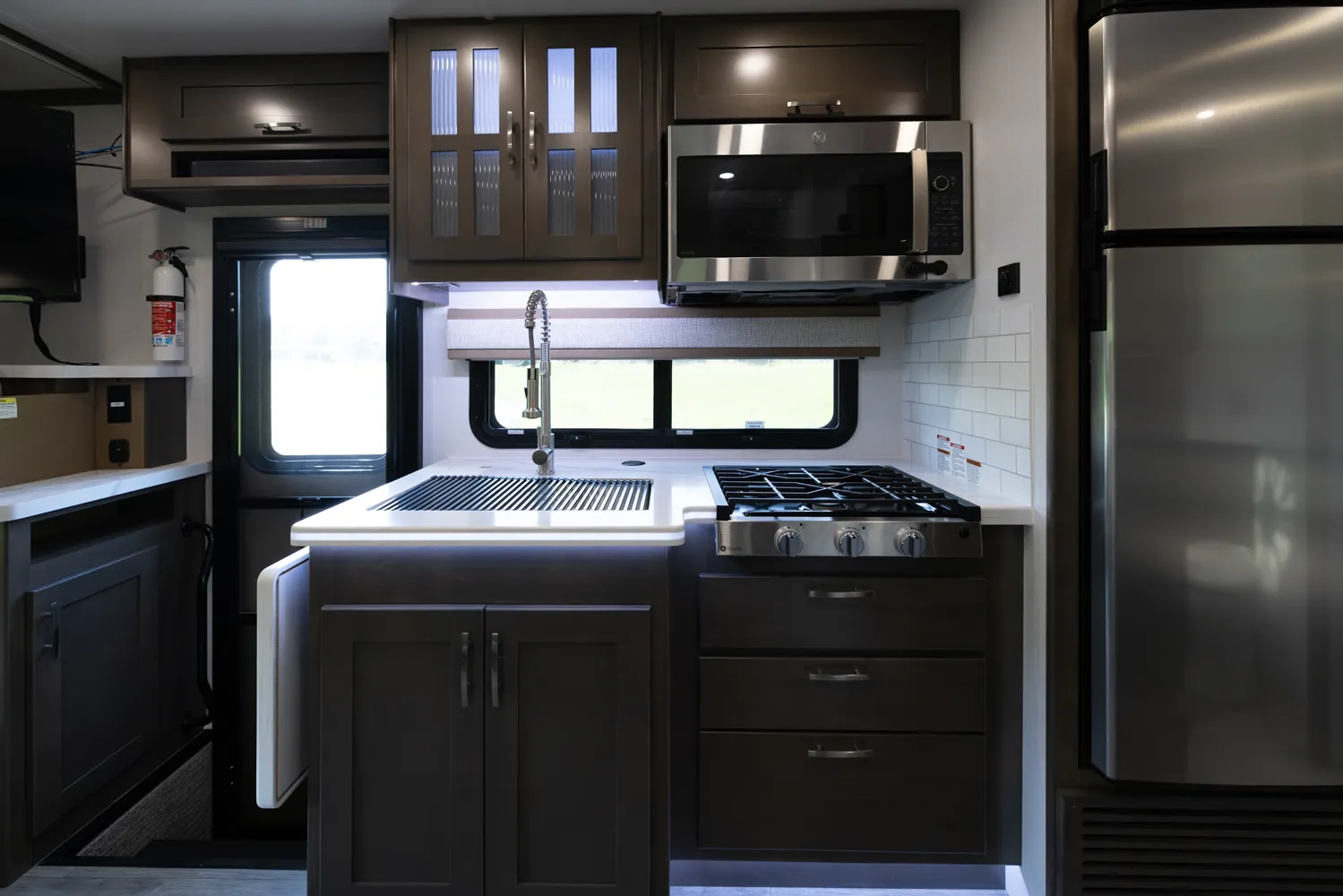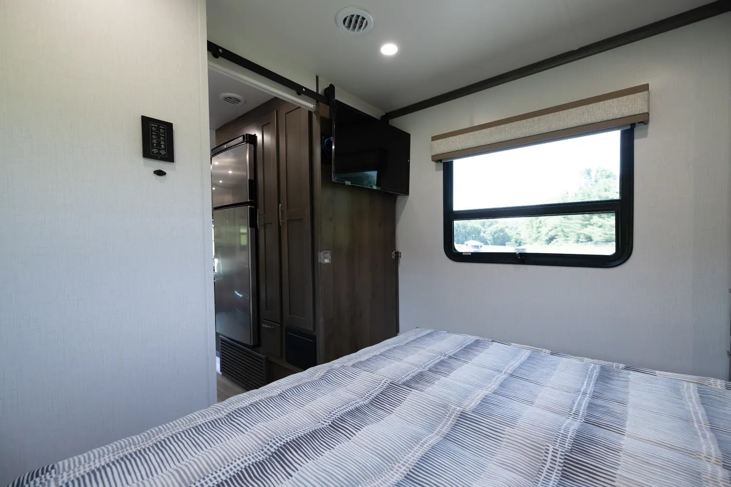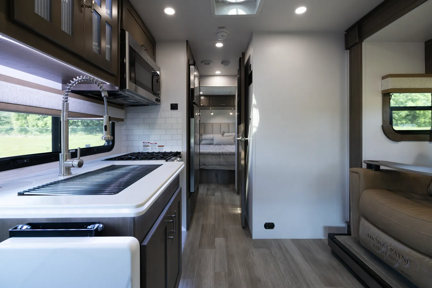 This 31'2" floorplan offers a private rear bedroom with a queen size bed, large wardrobe and pantry, standard booth dinette in the living area slide room, a fully equipped kitchen, and a full bath.