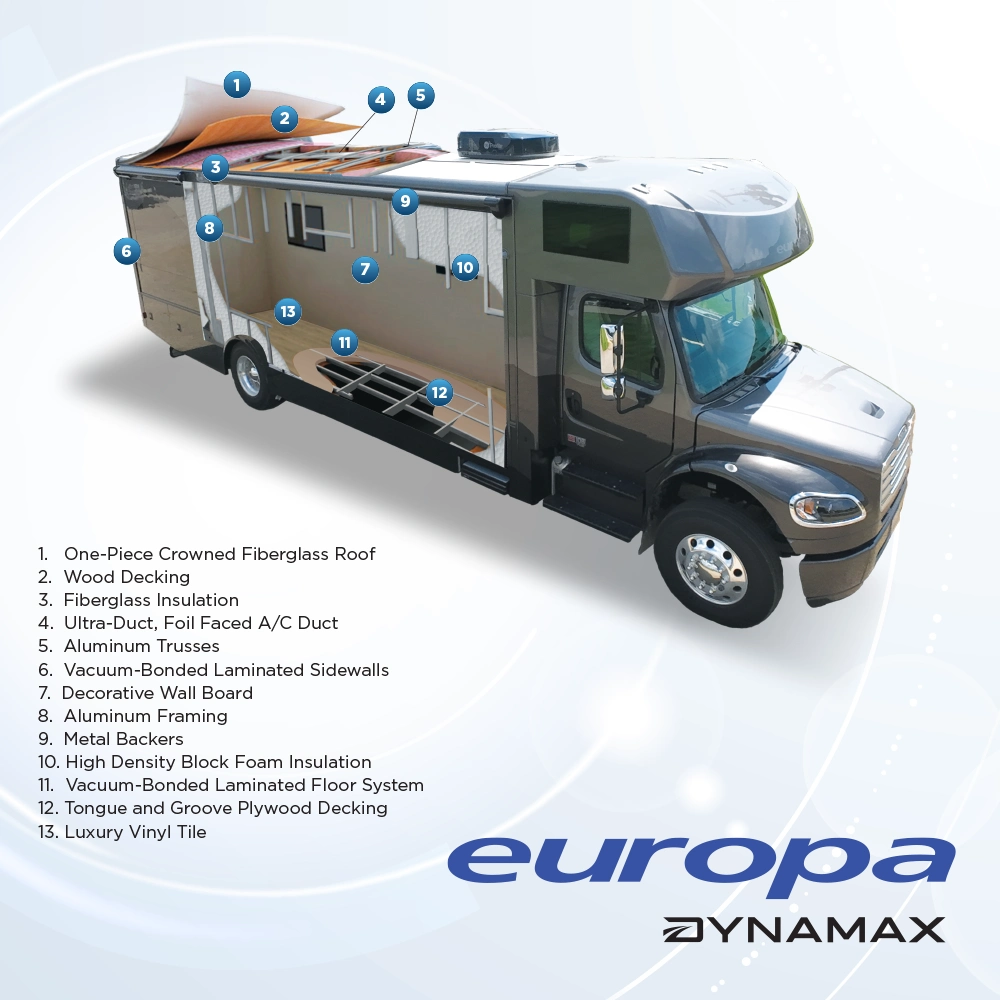 The newest member of the Dynamax lineup, the Europa is built on a Freightliner® M2 106B Chassis with a Cummins® B 6.7 Turbo Diesel Engine, bringing all the power and strength you need in a Class C Motorhome.