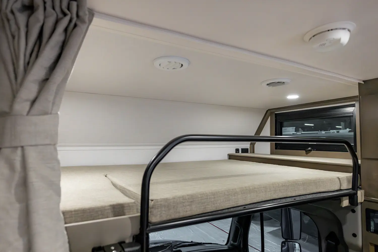 • Extended Fiberglass Front Cap with Cab-Over Bunk Mattress and Privacy Curtain