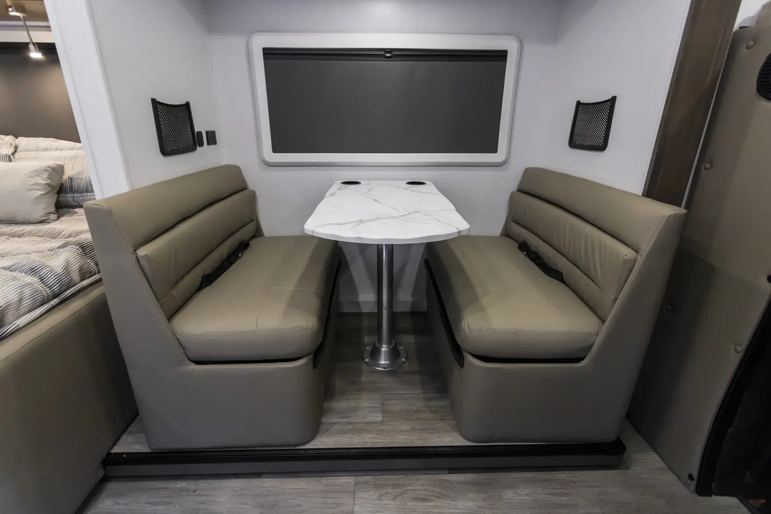 The 24SSSFXM has one slideout and one entry. Exterior features a 16 foot awning. Interior layout front to back: front cab (cabover bunk optional); off-door side slideout with booth dinette, murphy bed, and overhead cabinet; door side entry, kitchen counter with sink and cooktop, overhead cabinet with TV, 12V refrigerator, and wardrobe; rear full bathroom with overhead cabinets.